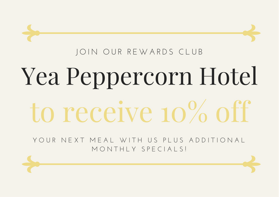 Join the Yea Peppercorn Rewards Club! We would love to have you join our Rewards Club and receive 10% off your next meal with us PLUS additional monthly specials delivered to your inbox! Simply Enter your details, confirm your email address and print off your 10% voucher! Success! First Name Last Name Email Join us Now